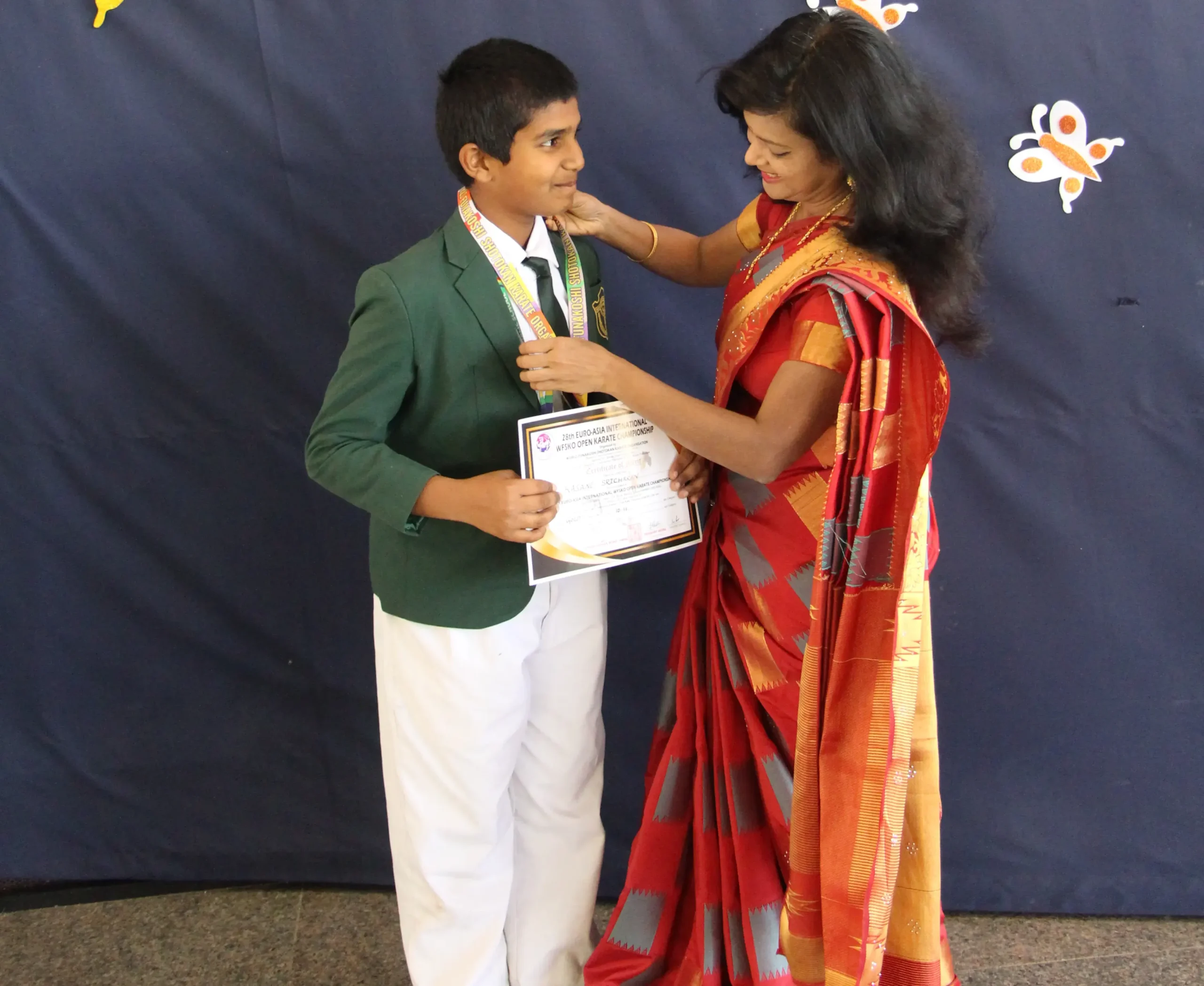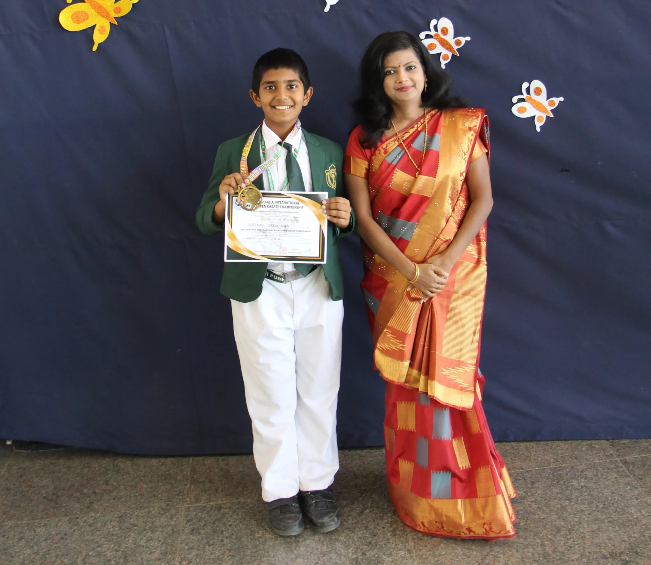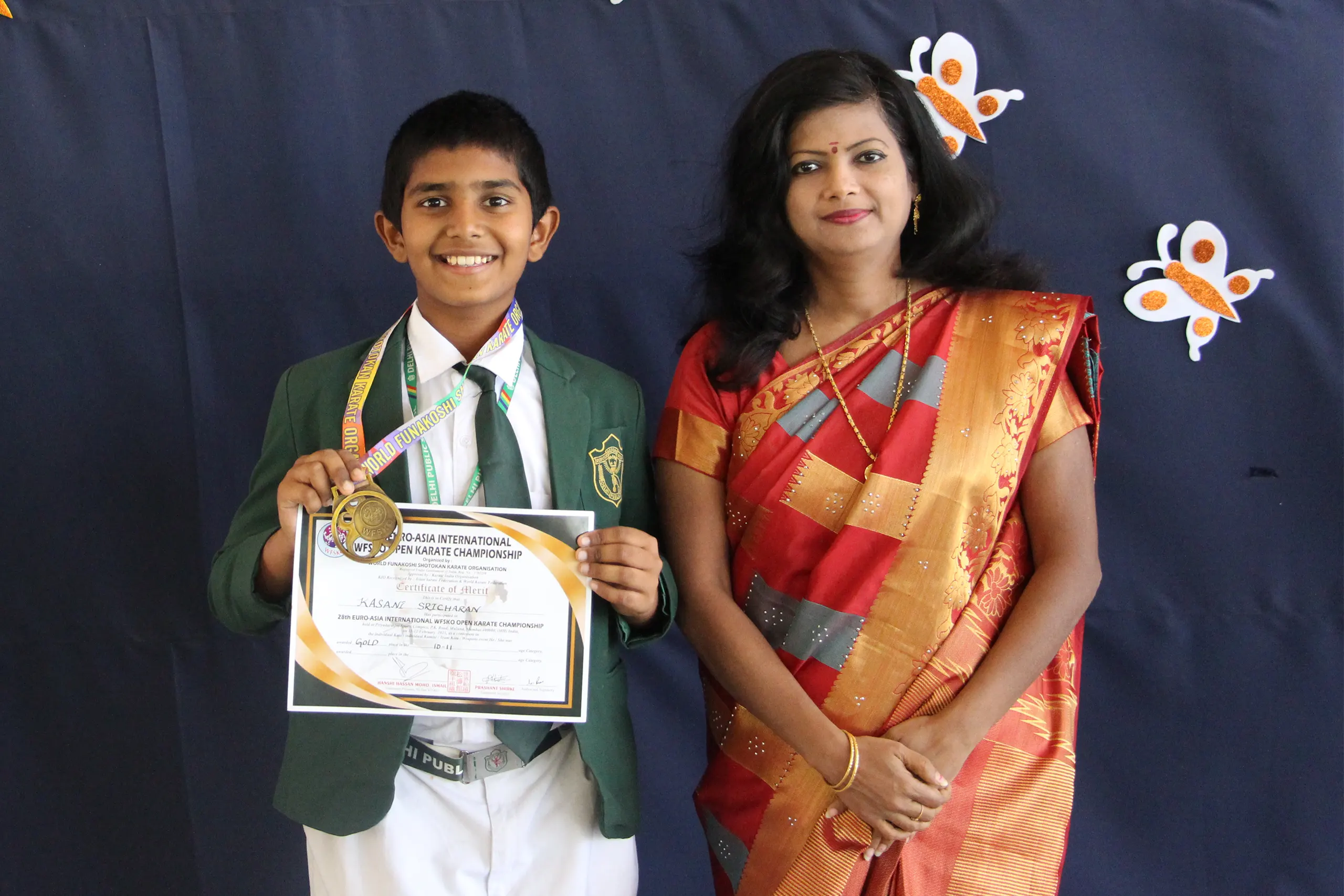 A grade VI student, KASANI SRICHARAN of Delhi Public School, Warangal participated in the 28th EURO-ASIA INTERNATIONAL WFSKO OPEN KARATE CHAMPIONSHIP, organized by WORLD FUNAKOSHI SHOTOKAN KARATE ORGANISATION, on 12 February 2023, Sunday, in Mumbai. He secured a Gold Medal in the tournament. The Pro Vice-Chairman, Shri Ravi Kiran Reddy, the Principal Smt. Pillai Manjumol Shivashankar and the Vice-Principal, Smt. Kiranmai appreciated Kasani Sricharan for his achievement.