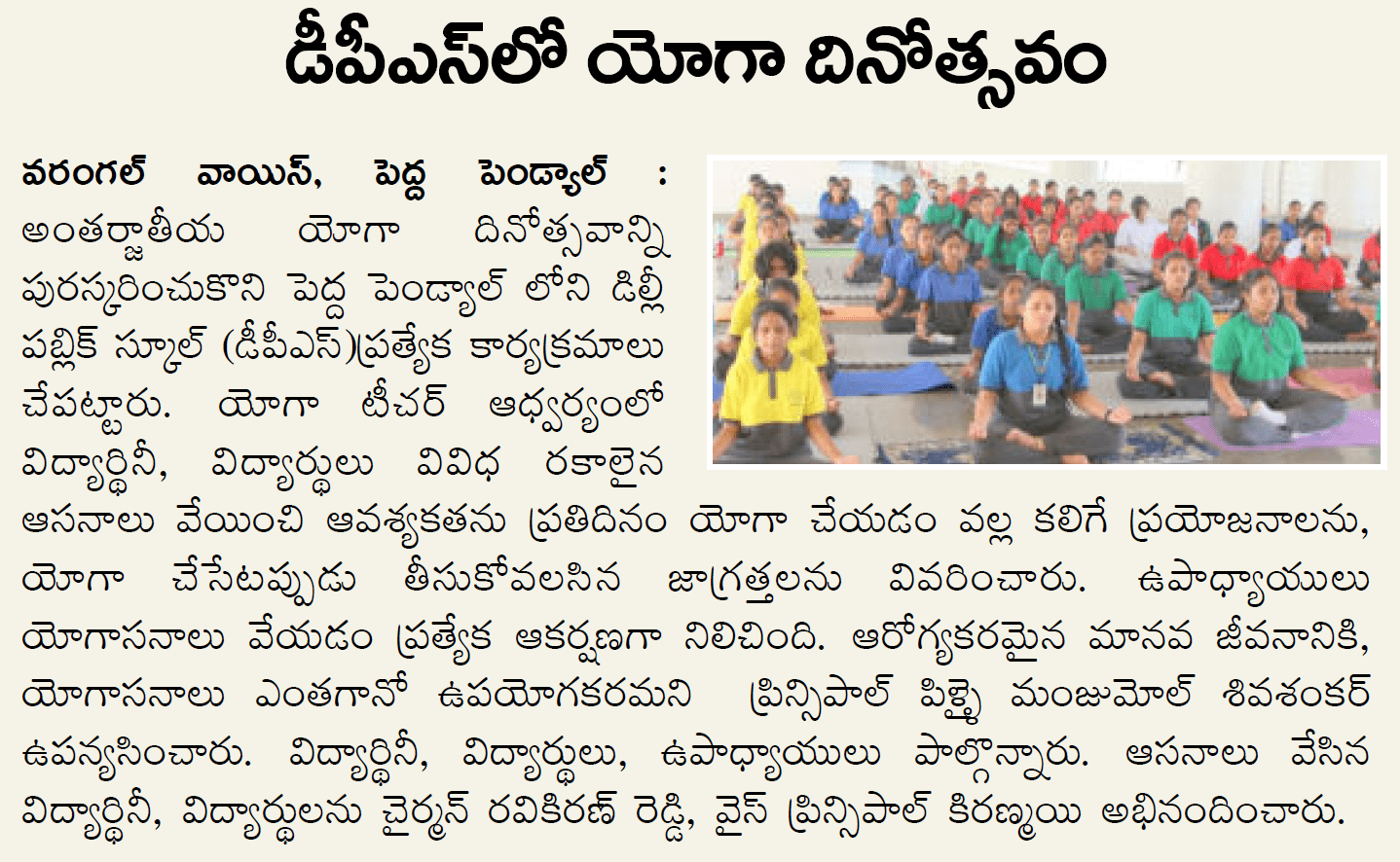 Newspaper article on DPS Warangal 2023 Foundation Day & Yoga Day